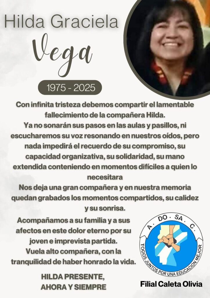 La comunidad educativa expresó profundo pesar por la pérdida de Hilda Graciela Vega, destacando su compromiso, solidaridad y calidez humana. Desde la Asociación Docentes de Santa Cruz (ADOSAC) – Filial Caleta Olivia, la despidieron con un mensaje que refleja el cariño y respeto que supo ganarse entre colegas y estudiantes.