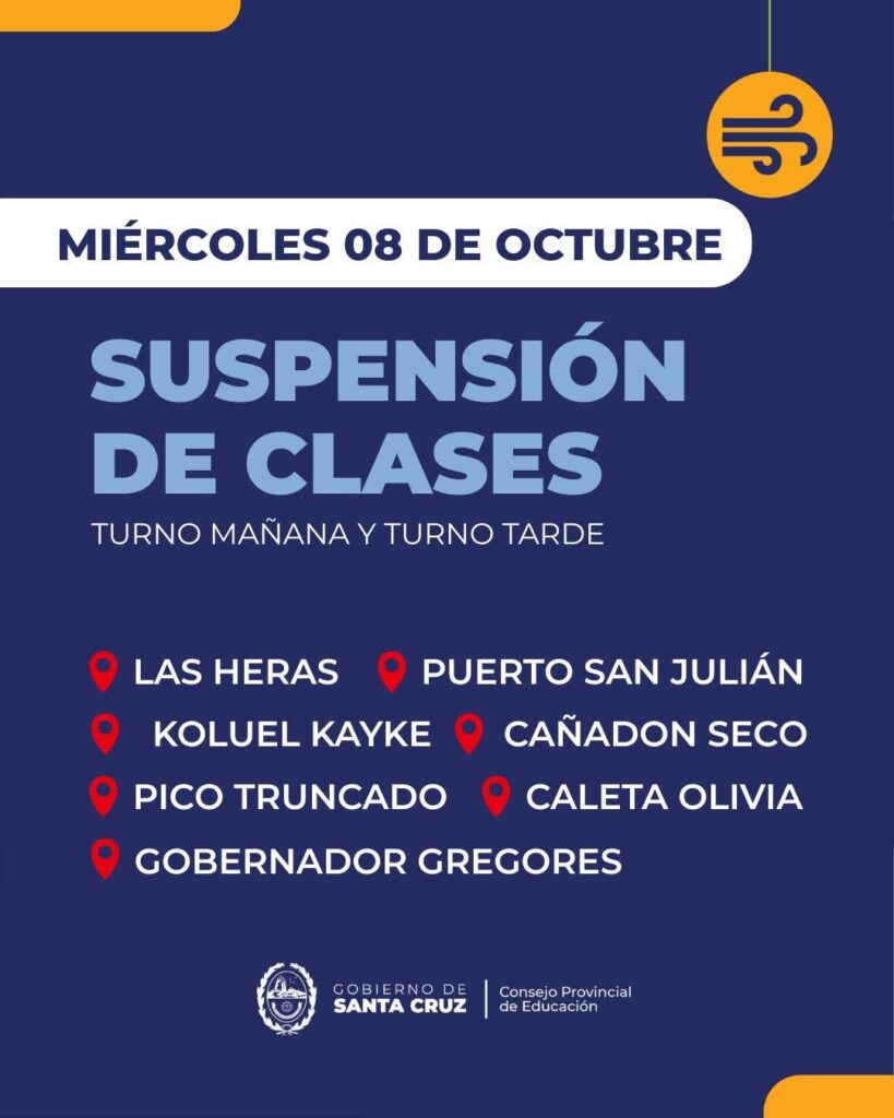 La medida alcanza a los establecimientos educativos de Las Heras, Caleta Olivia, Pico Truncado, Puerto San Julián, Gobernador Gregores, Koluel Kayke y Cañadón Seco, y tiene como objetivo priorizar la seguridad de estudiantes, docentes, familias y personal escolar ante las condiciones climáticas adversas que afectan la región.