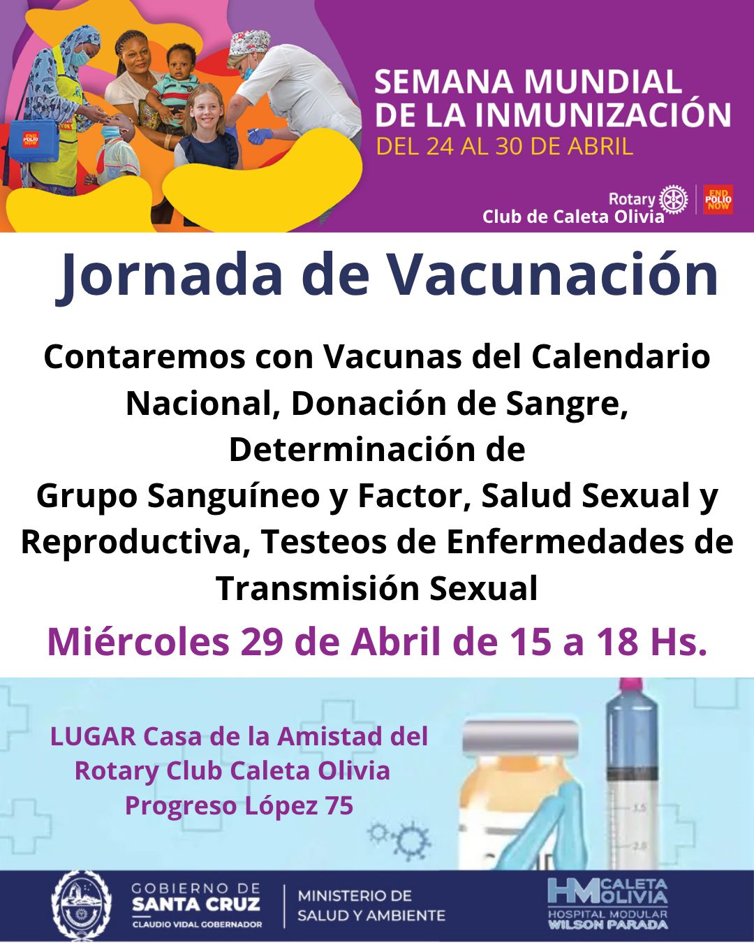 En este marco, se invita a la comunidad a participar de una jornada de salud que se desarrollará el miércoles 29 de abril, de 15 a 18 horas, en la Casa de la Amistad del Rotary Club, ubicada en Progreso López 75. La actividad cuenta con el acompañamiento del Hospital Zonal y el Hospital Modular.