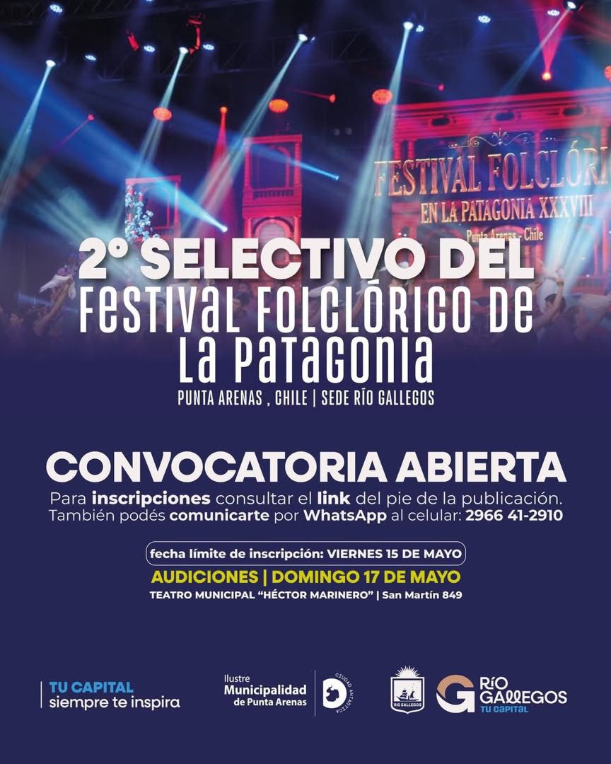 La Municipalidad de Río Gallegos, en conjunto con la de Punta Arenas, lanzó la convocatoria para participar del 2° Selectivo del Festival Folclórico de la Patagonia, una instancia que permitirá a artistas locales representar a la ciudad en uno de los escenarios culturales más importantes de la región.