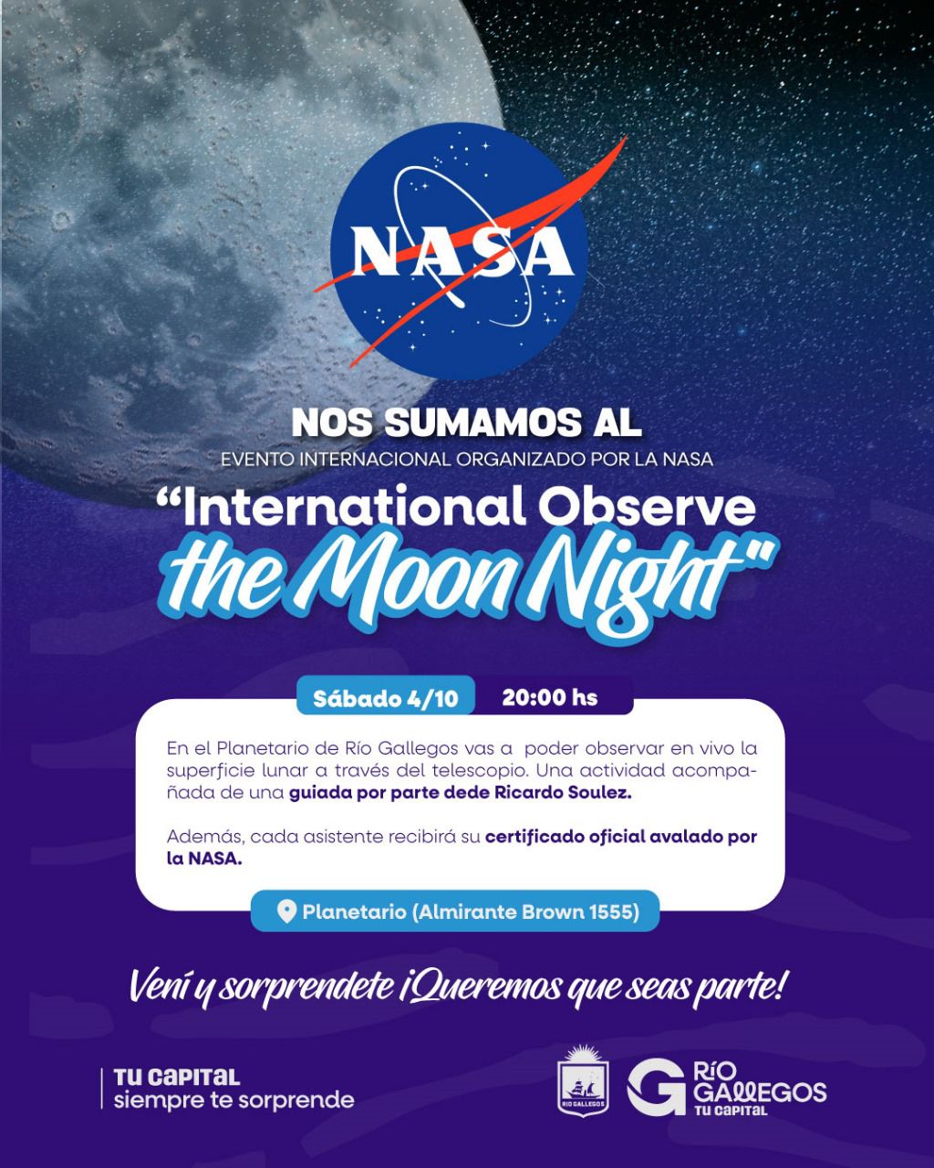 La Municipalidad de Río Gallegos invita a la comunidad a participar de una experiencia única este sábado 4 de octubre a las 20 horas en el Planetario, el más austral del mundo, en el marco del evento global “International Observe the Moon Night 2025”, impulsado por la NASA.